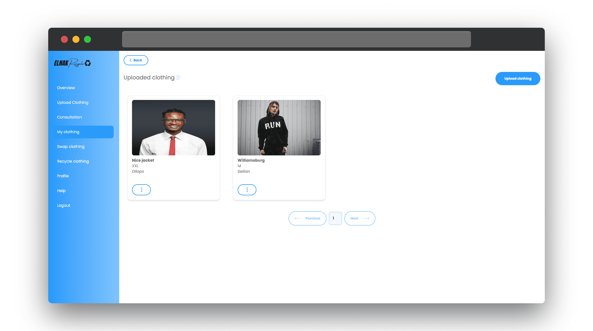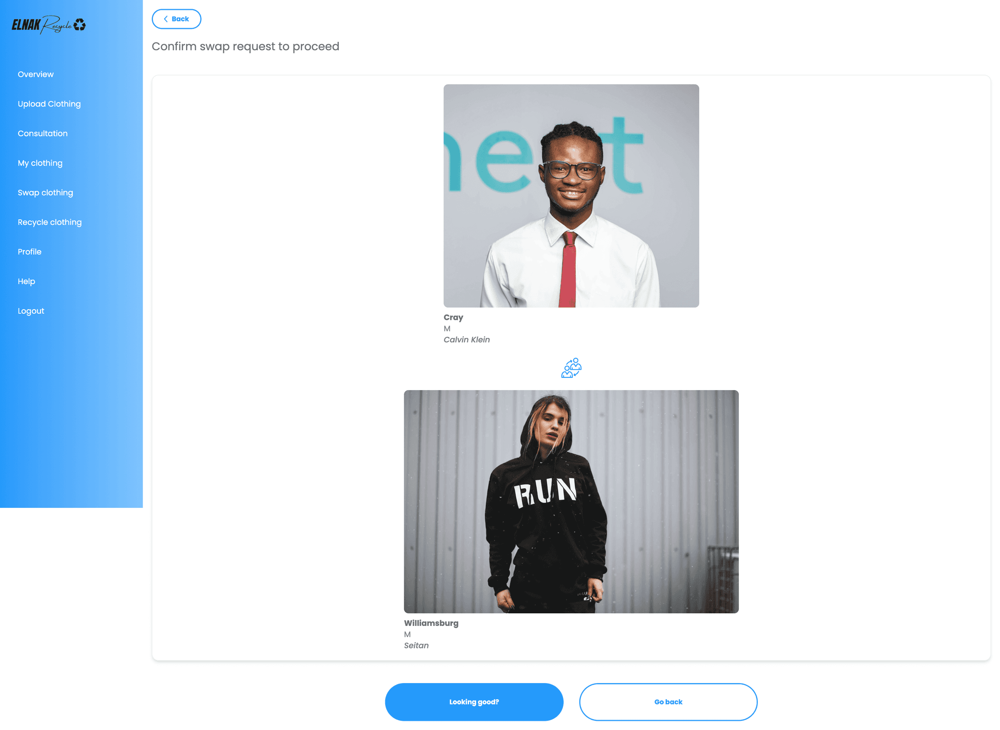 The clothing upload feature enables users to upload clothing they no longer wanted in order to request a recycle or upcycle from Elnak, or exchange(swap) the clothing with other users on the platform.